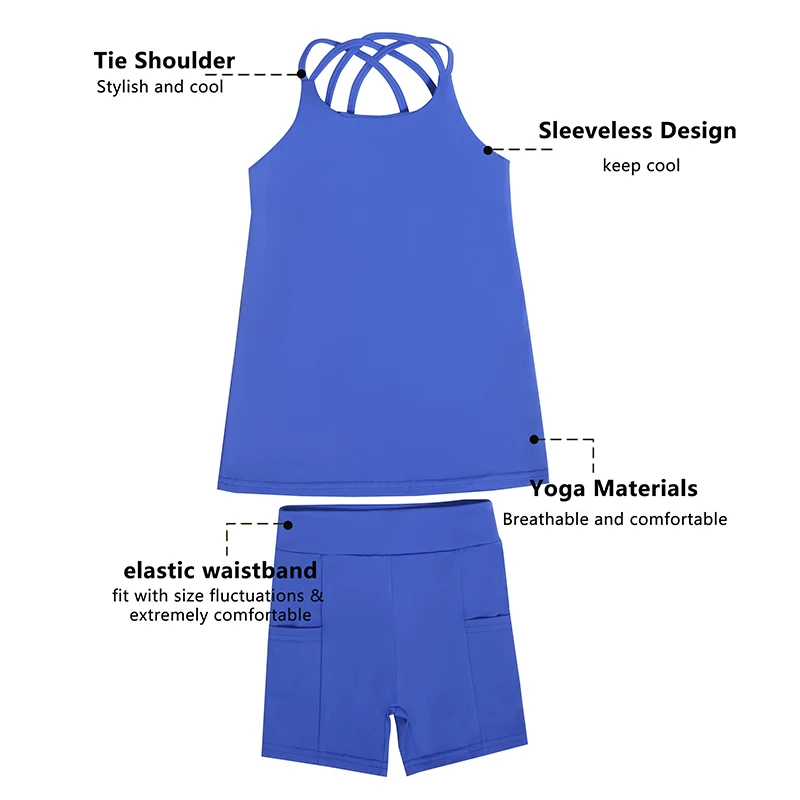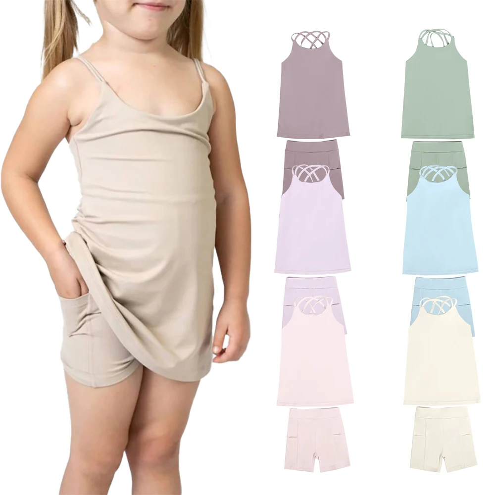 Most Popular Summer Girls Yoga Tie Shoulder Solid Color Spandex and Polyester Elastic Waistband Baby Active Sets Girls Cloth